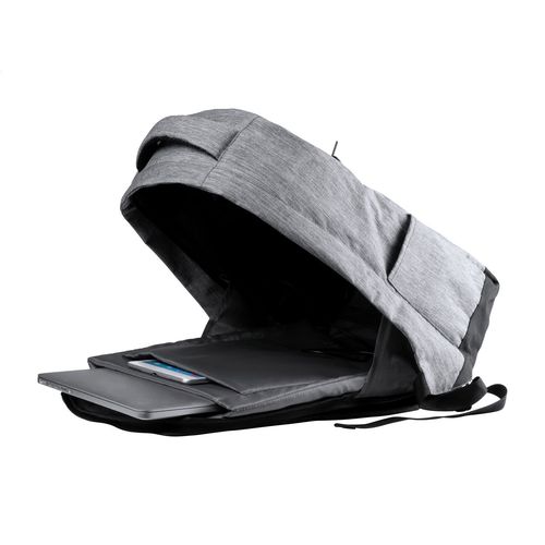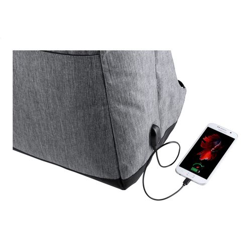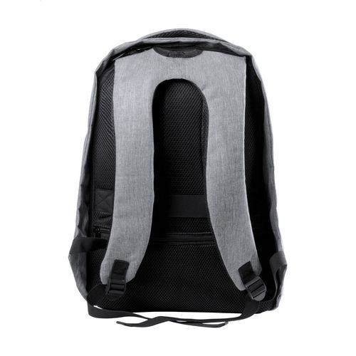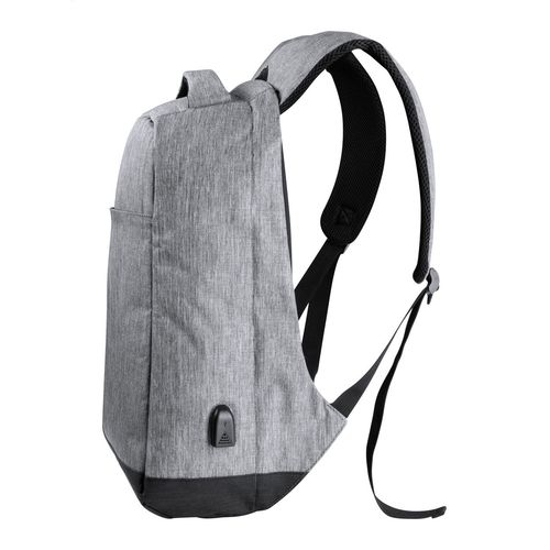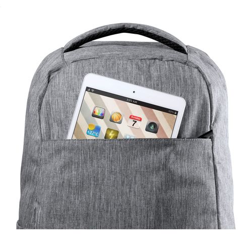 Anti-theft backpack with multiple pockets, padded laptop (15") and tablet (12") compartment, padded back and shoulder strap. With trolley strap and built-in USB connection for power banks. 300D Polyester.