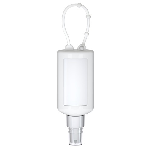 50 ml PET bottle (white) with white pump and transparent protection cap; silicone cover and loop in frost. Refillable. Bottle made from 100% recycled PET, white with a slight R-PET colouring.