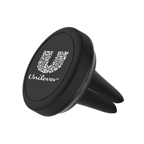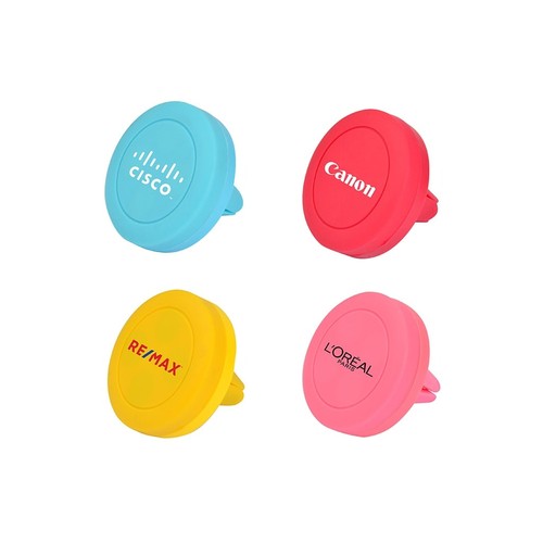 The two-piece promotional magnet phone holder is used by attaching one piece to the phone and the other piece to the place where you want to fix it in the vehicle.