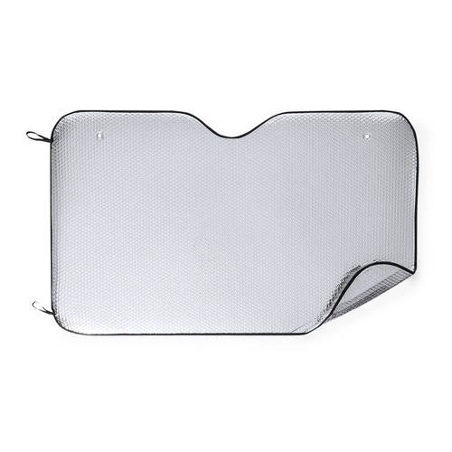 Aluminum sunshade with bubble on both sides in silver metallic finish with black piping. Size 130x80cm, with metal reinforcement rings, elastic straps for folding, two suction cups for adjustment and presentation unfolded for easy printing.