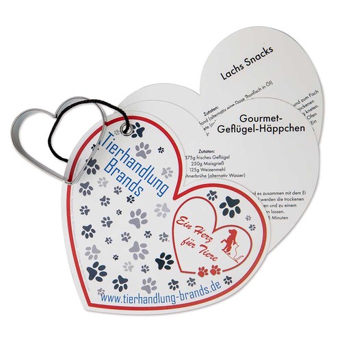 Natural meat, some fruit and vegetables as well as healthy carbohydrates and fats - this is what a dog's digestive system has been designed for. Cats, too, eat products without additives in their natural environment. Meanwhile, lovers of fur noses attach just as much importance to a healthy diet for their furry family members as they do for humans.To ensure that velvet paws and co. receive individually tailored food, pet owners can now lend a hand themselves and quickly pamper their pet with the help of the nutritious treat recipes and the stainless steel mould in the shape of a heart. The cover page of the heart-shaped recipe pad can be customised and is therefore super suitable for the advertising message of pet-related advertisers. Suitable are all recipes for dogs and cats. Please note that the recipes are only available in German.