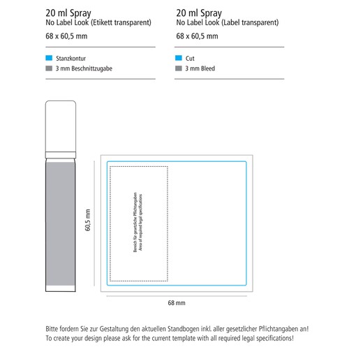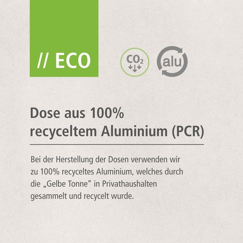 20 ml aluminum can made from 100% recycled aluminium, brushed, with transparent spray head and transparent protective cap. To produce the sprays we only use recycled aluminum for the cans and PP for the caps collected in private housholds and recycled by using the local waste separation system.