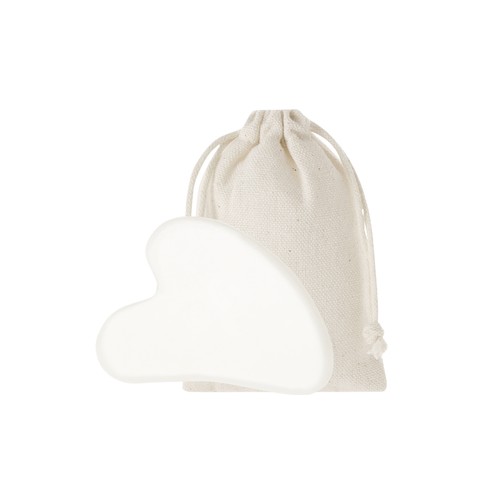 Facial massager made of white jade stone. Ideal for complementing facial care routines. Presented in a natural cotton bag.