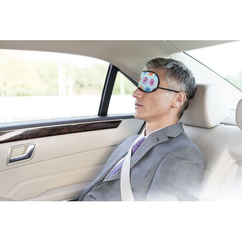 Custom made travel eye mask in polyester (140 g/m²), with foam padding, black piping and strap. With all over sublimation printed graphics. MOQ: 100 pcs.