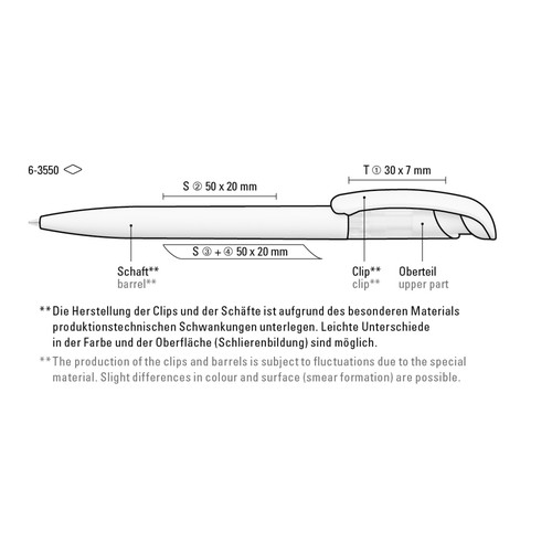 Retractable ballpoint pen with barrel and clip made from 100% renewable biodegradable material. Upper part made from transparent frosted ABS plastic.