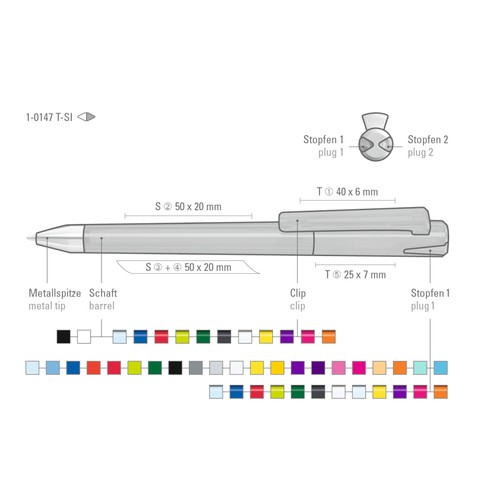 Twist ballpoint pen with transparent glossy housing and upper part with two coloured plug in opaque or transparent. Heavy metal tip chrome plated.