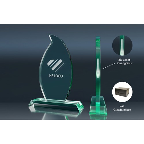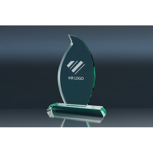 The Trophy FLAME is an impressive glass award in the shape of a stylized flame, resting on a sturdy base.