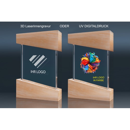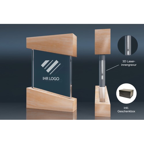 This glass award is framed in light wood, beautifully highlighting the combination of glass and wood.