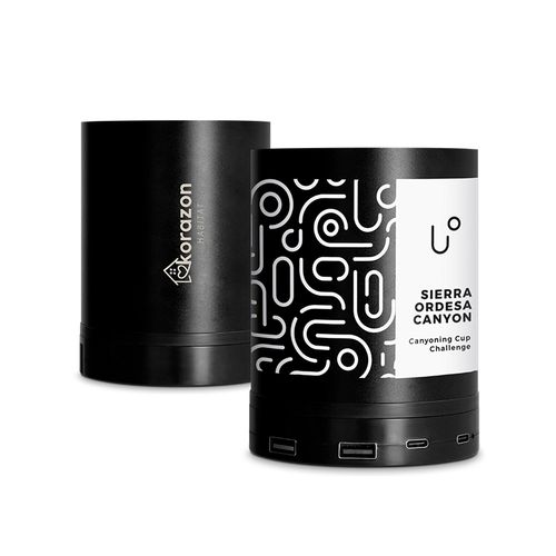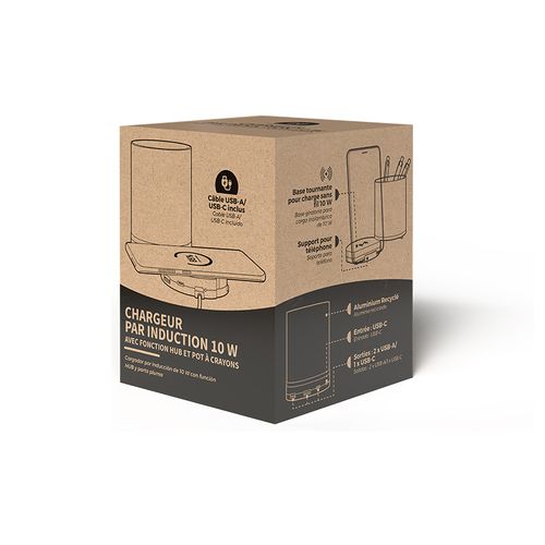 This 3-in-1 pencil holder, made of 100% recycled aluminium from a GRS-certified supply chain, combines ingenuity, technology and eco-responsibility to enhance your office. Turn its base to reveal a 10W induction charging space and take advantage of its notch to put your phone down. With its three ports, 2 USB-A and 1 USB-C, its 1 m charging cable, this hub becomes the essential companion of your office. Delivered in an individual illustrated box. Branding in 1 Colour, white by default or Laser engraving.