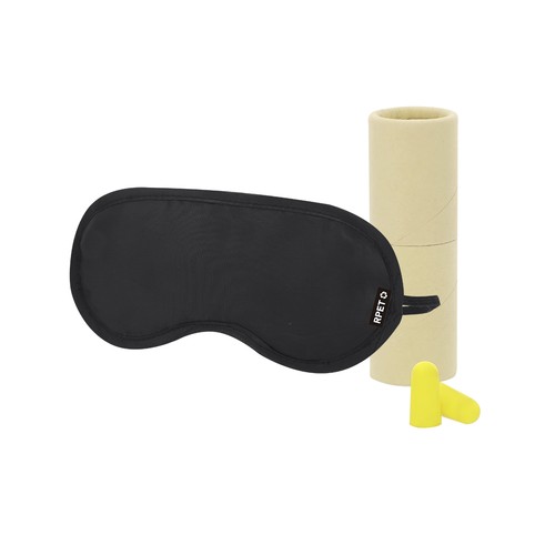 Travel set with sleep mask and earplugs. Eye mask made of soft and comfortable RPET with matching adjustable elastic band, with label identifier. Earplugs in comfortable yellow EVA material. Presented in a practical cylindrical cardboard kraft case.The RPET material is made from recycled plastic, promoting the reuse of plastic waste and helping the planet's sustainability.