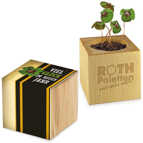 This cube offers even more space for the seeds and your advertisement. The cube made of real light, European wood will be delivered with spruce seed and a compost pellet and challenges the green finger of the hobby gardener. Your advertisement will find place on the surrounding paper band and a laser engraving is additionally possible. An eyecatcher on every desk and the company that advertises stays in mind.