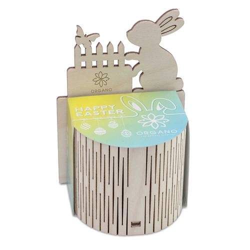 The lovingly designed Tiny Garden is a naturally beautiful Easter highlight. The small clay pot is surrounded by a filigree wooden fence and complemented by a rear back wall with a fine rabbit outline – ideal for a laser-engraved advertising message or logo. Filled with a compost pellet as soil and egg tree seeds, it creates a charming mini garden project. The individually printed paper band seals the set and harmoniously completes the product – an appealing giveaway that perfectly combines naturalness and advertising impact.