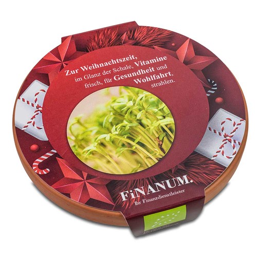 In a world full of stress and hectic, it is more important than ever to look after your health. Superfoods, rich in essential vitamins and minerals, play a crucial role in this. These nutritious bombs strengthen the immune system, promote vitality and support a healthy life. Our vitamin-bowl offers an easy way to grow organic superfoods at home and enjoy an extra daily dose of health. The bowl is made of high-quality terracotta with a diameter of 11 cm. It comes with a compost pellet and organic seeds, which are good for more than one planting. You can choose from the following seed varieties: arugula, radish China rose, radish Sango and cress. The customised paper band offers a large advertising space.
