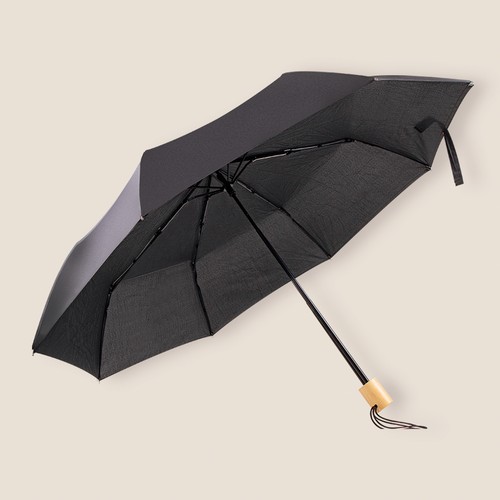 Manual opening folding umbrella 95 cm diameter made of 100% RPET pongee material, from recycled plastic. With metal rods, wooden handle and carrying cover.