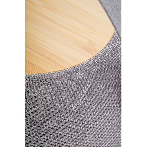 Wireless speaker in RPET fabric covered recycled ABS housing with LED light at the bottom and bamboo plate wireless fast charger (15W) on the top. With PU leather carry strap, hands-free call function and built-in rechargeable battery (1200 mAh). Including USB charger cable.