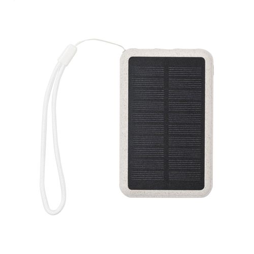 USB power bank in ecological wheat straw plastic housing with built-in solar charger and 5000 mAh battery. With 2 USB and 1 USB-C charger ports. USB-C input port.