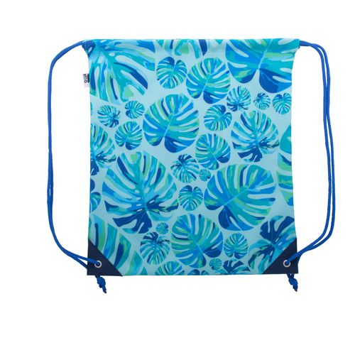 Custom made drawstring bag in 600D RPET polyester, with reinforced PU leather corners and thick matching colour strings. With all over sublimation printed graphics and distinctive RPET label. MOQ: 25 pcs.