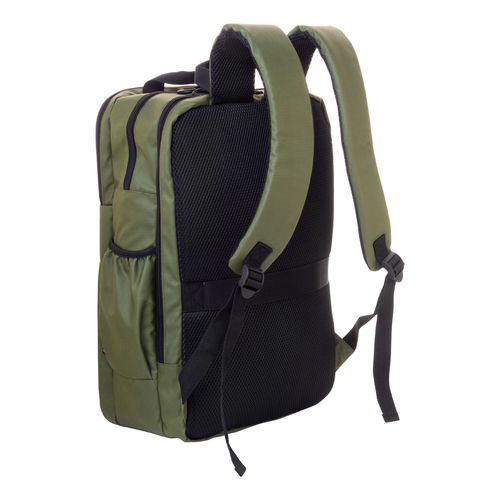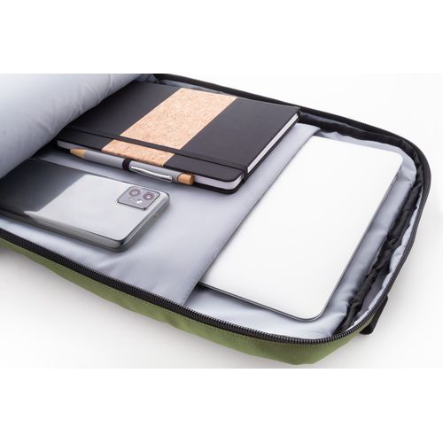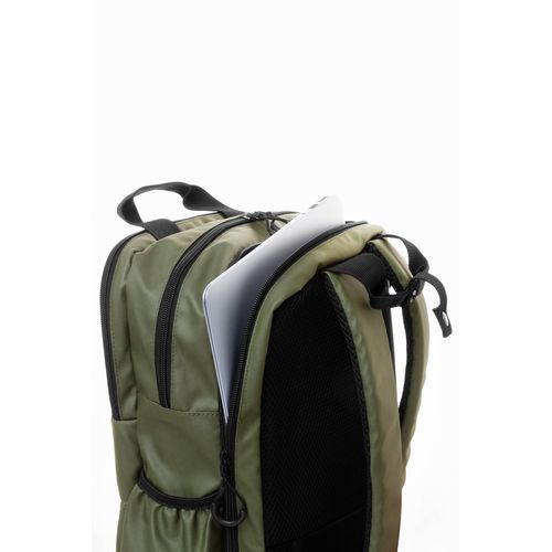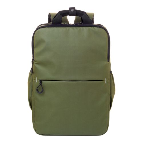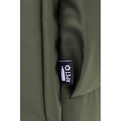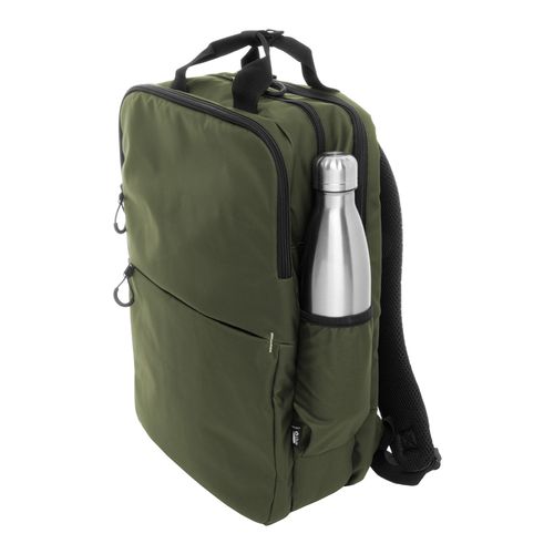 Waterproof RPET backpack with 2 zipped compartments, 2 zipped front pockets, side pockets and padded laptop (16") compartment. With trolley strap, padded back and shoulder straps. PU coated 600D RPET polyester, with distinctive RPET label.