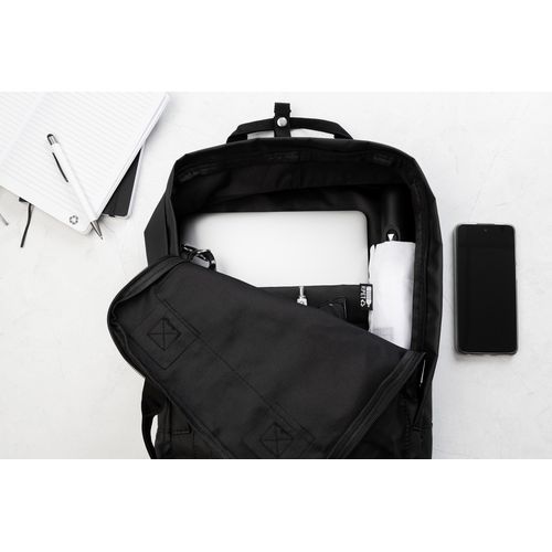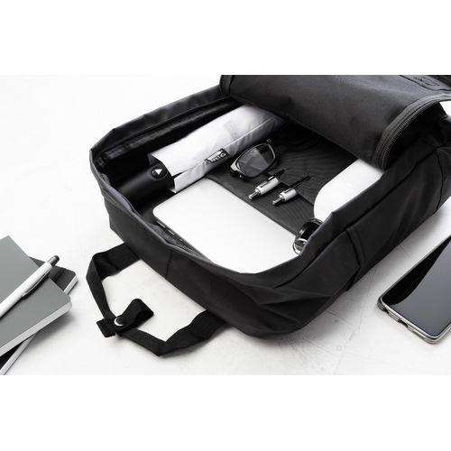 Waterproof, soft recycled PU leather backpack with zipped main compartment, 2 zipped front pockets, side pockets and padded laptop (15") and tablet (10") compartment. With padded back and shoulder straps. With distinctive recycled PU label.