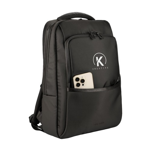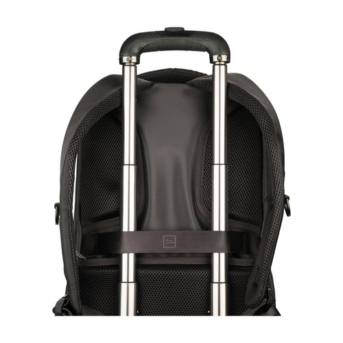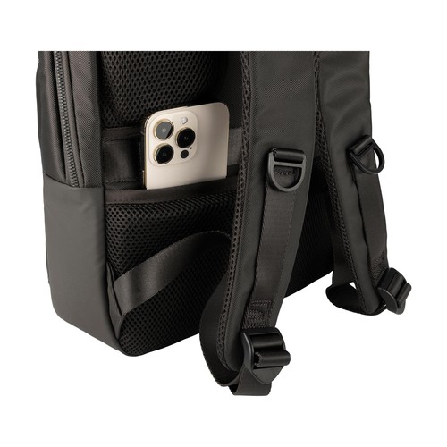 Laptop backpack from Italian brand Tucano. This modern, compact backpack is made with fabric produced from recycled plastic, including 20 recycled PET bottles. The spacious compartment has a mesh zip pocket and a shock-resistant storage compartment for laptops up to 15.6 inches or MacBook Pro 16 inches. The front zip pockets, one of which has two slip pockets, are ideal for storing accessories you want to keep close at hand. There is a hidden zip pocket on the back for safely transporting personal items and travel documents. Fully lined. The adjustable, padded shoulder straps and ergonomic back are equipped with breathable mesh for extra comfort. With a handy trolley strap and striking, high-quality zip fasteners. Capacity approx. 17 litres.