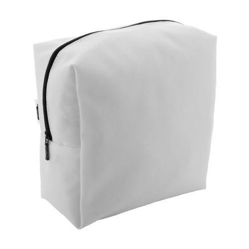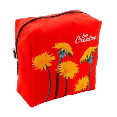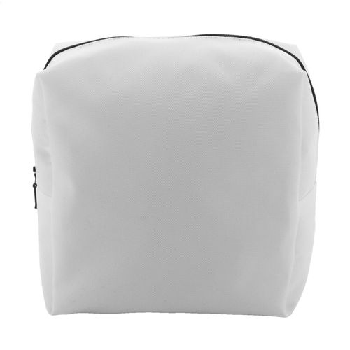 Custom made, square shaped zipped cosmetic bag in 600D RPET polyester. With all-over sublimation printed graphics. MOQ: 50 pcs.