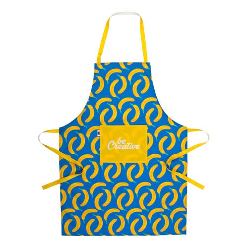 Custom made 600D RPET polyester apron with front pocket and all over sublimation printed graphics. MOQ: 25 pcs.