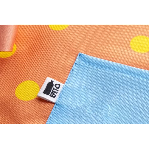 Custom made, 600D RPET polyester bistro apron with triple front pocket and all over sublimation printed graphics and distinctive RPET label. MOQ: 25 pcs.