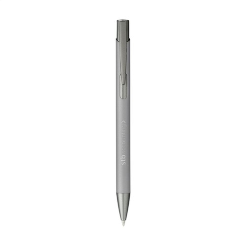WoW! Blue ink ballpoint pen with a barrel made from recycled aluminium. The barrel has a rubberised soft-touch finish. With sturdy metal clip/push button. RCS-certified. Total recycled material: 94%. By using recycled aluminium, fewer new raw materials are used during the production of this product. This means less energy consumption and less use of water.