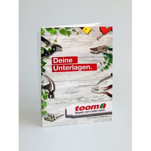 Folder DIN A4; 2 pieces with 2 tabs and business card punching; Print: 4/0-coloured (printed outside), laminated with glossy foil; Format: 215 mm wide x 302 mm high, back width 5 mm; material: 0.4 mm thick chromoboard 260g for 1 mm folder filling height; Front: white; Back: matt writable