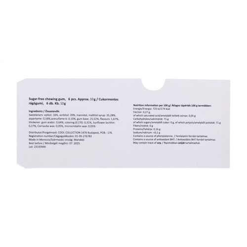 6 pcs sugarfree chewing gum in blister with custom made, full colour printed paper sleeve. MOQ: 100 pcs.