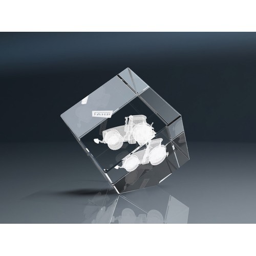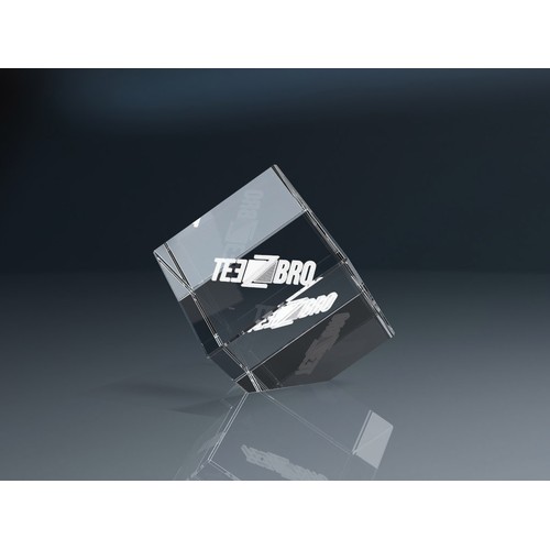 Glass cube, dimensions 40 x 40 x 40 mm with beveled corner, 1 mm chamfer, polished surfaces, high-quality optical glass BK7, free of inclusions, bubbles, and stresses, suitable for 2D and 3D internal glass engravings.