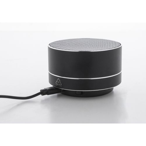 Recycled aluminium wireless speaker with metal mesh, LED light on the bottom and rechargeable battery (300 mAh). With hands-free call and micro SD MP3 playback functions. Including USB charger cable.
