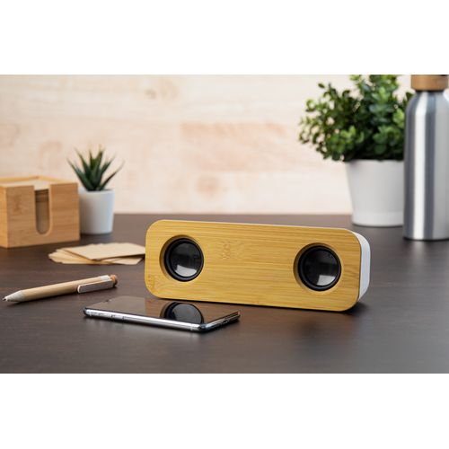 Wireless speaker in recycled ABS and bamboo housing with 2 speaker drivers and built-in rechargeable battery. With hands-free call and FM radio functions. Including USB charger cable.