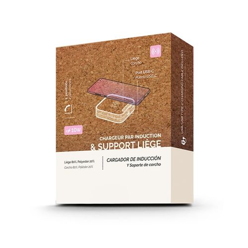 10W induction charger and foldable phone holder with soft design and unique grain agglomerated cork, made of 80% cork and 20% polyester. USB Type-A/USB-C cable included. Delivered in individual illustrated box. Laser engraving on the cork or Quadri-Digital branding on the white flap.