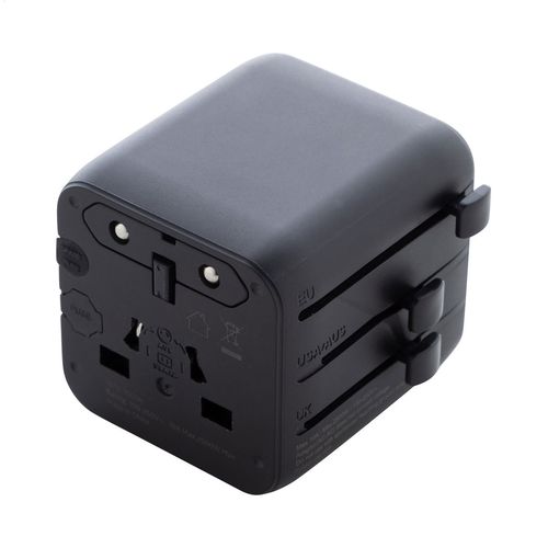 Ultra compact, universal world-wide travel adapter in recycled PC plastic, with built-in wall plugs for USA, Europe, UK and Australia.
