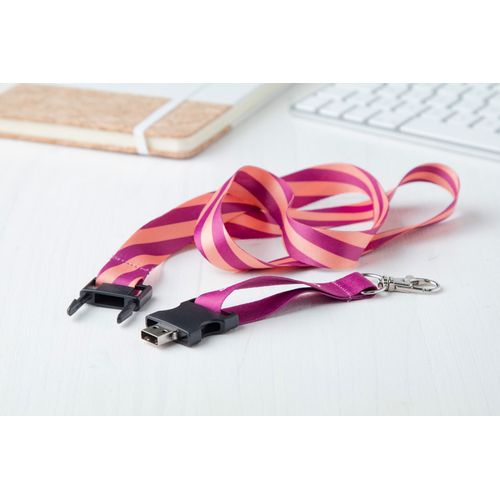 Custom made, polyester lanyard with detachable metal carabiner. With built-in 8 GB USB flash drive inside the plastic buckle. With sublimation printed graphics on both sides. MOQ: 100 pcs. USB 2.0.