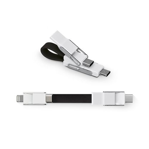 Your charger at your fingertips ! This 6-in-1 keychain charging cable, equipped with 2 inputs USB-A and USB-C, and 3 outputs double-side Lightning, micro-USB and USB-C, charging cable and data transfer, allows you to have the right tip to charge your phone, to be able to charge two mobiles between them. Supplied with ring, in an individual illustrated pouch. Branding on the white tip in 1 Colour or Quadri-Digital.
