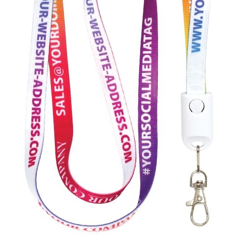 Do you need premium Lightning and Micro USB cables for visitors and staff to use in your offices which have a huge branding area? Do you have a forthcoming event like a trade show, exhibition, conference, outdoor event or other marketing campaign where you could use printed lanyards to promote your organisation and brand? If the answer is yes, then look no further than these high quality promotional cables. The Promo USB Lanyard Cable can charge (1A) and sync a huge range of different products with a Lightning charger (charges iPhones 5 to X) with a built in Micro USB port for hundreds of devices such as smart phones and cameras (New USB C also available upon request). The cables are made from a tough and durable nylon fabric allowing them to be wrapped around and over objects without getting tangled and take up a lot less space than some other conventional cables. Perfect for events, university hand outs and great for electronics and technology conferences. The handy trigger clip allows the wearer to add ID/VIP cards or even attach keys and personal items. The promotional cable is CE certified and ROHS compliant. You can print in full colour along 100% of both sides of the cable allowing for maximum promotional potential! Printing is also available on the port cover. The Fabric USB Lanyard Cable is a unique, high quality, essential promotional product. Also available in a tidy keyring size: search 'N0137' in our product search bar above.