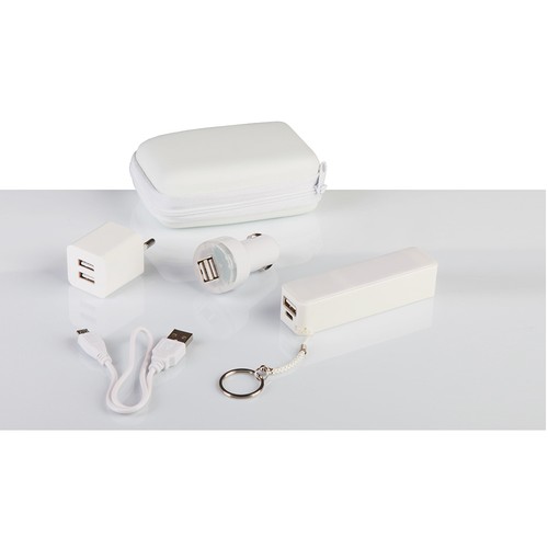 End-of-series item from our outlet, the power set with a 2200 mAh USB charger in plastic and PU (E14544) is the perfect accessory for those who want to stay connected while traveling.Ideal for charging electronic devices in any situation, this set offers a practical and complete solution to keep devices always charged.The set includes a USB charger with a 2200 mAh rechargeable Li-ion battery, a car charger, and a USB power adapter, all contained in an elegant PU case.The power set can be customized with screen printing, particularly suitable for flat color logos.