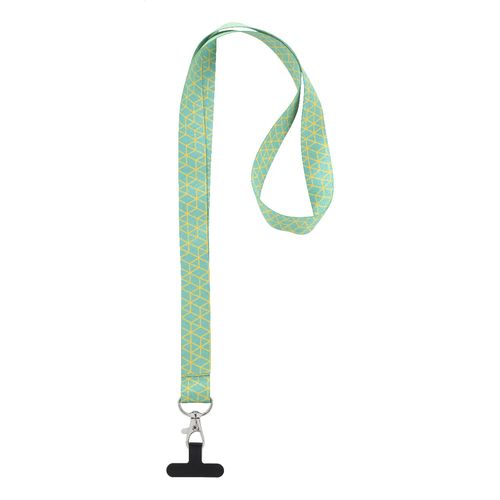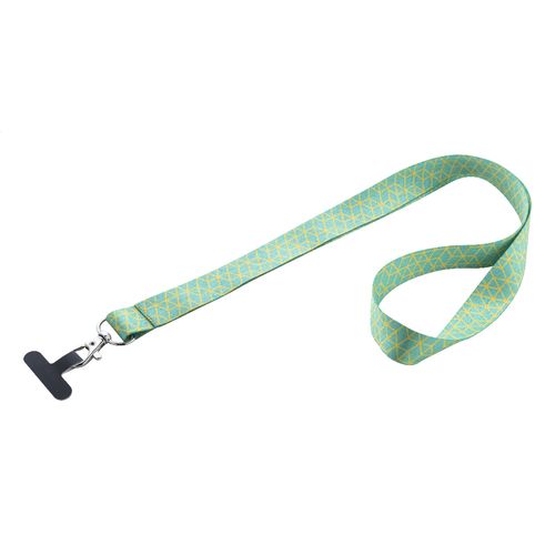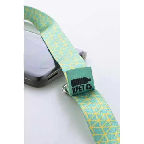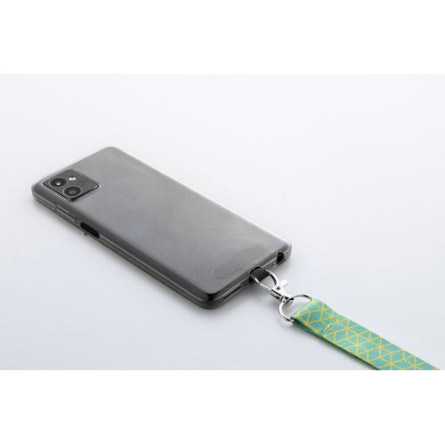 Custom made, RPET mobile holder lanyard with metal carabiner and phone insert in tearproof paper. With sublimation printed graphics on both sides. MOQ: 100 pcs.