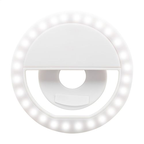 Plastic selfie ring light with 28 LED for mobile phones. With 3 adjustable brightness levels and built-in rechargeable battery. Including USB charger cable.
