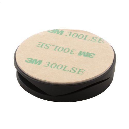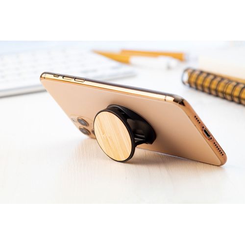 Bamboo covered, round shaped, plastic mobile holder with self-adhesive base.