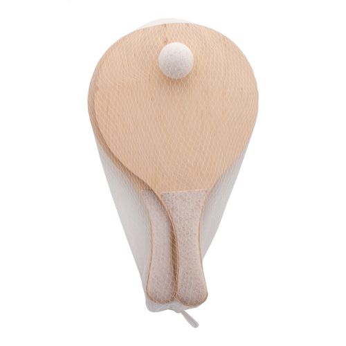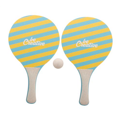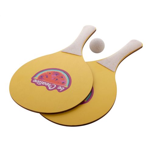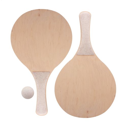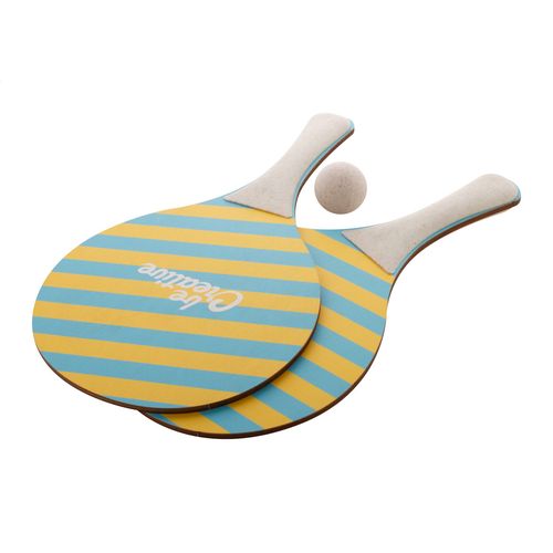 Custom made beach tennis with 2 rackets and one ball. Made of birch plywood and ecological wheat straw plastic. Price includes an identical full colour print on the front side of both rackets. MOQ: 50 pcs.