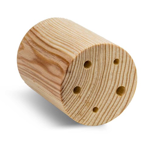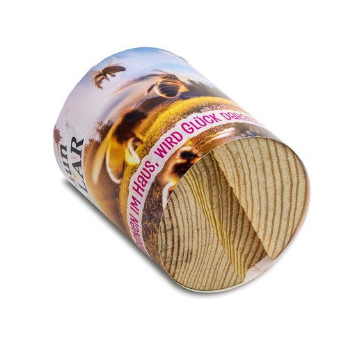 At a time when the natural habitats of bees are increasingly under threat, the bee log offers an ideal solution. This compact nesting aid, with five holes drilled in different diameters, provides space for various bee species. Simply hang it up outdoors on a nail or screw, protected from rain and wind. The surrounding paper band can be customized.