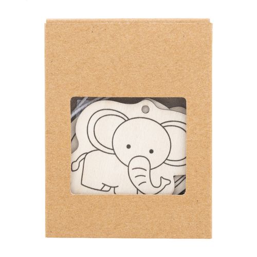 3 pc wooden animal figure colouring set, including 4 wooden coloured pencils and hanging cords. In kraft paper box.