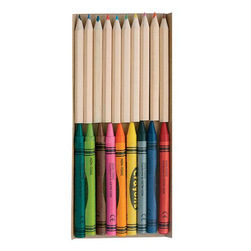 Coloured pencil (10 pcs) and crayon (9 pcs) set in windowed recycled cardboard box.