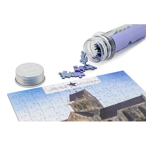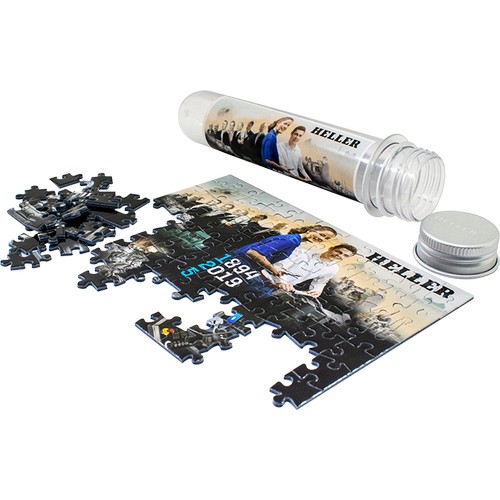 The micro puzzle consists of 99 pieces. The pieces come conveniently in a test-tube shaped container which is 5.9″ long with a 1.4″ diameter. There is a photo of the puzzle’s image on the tube to help complete the puzzle. Additionally,a logo can be printed on the aluminum cap of the tube with laser engraving.