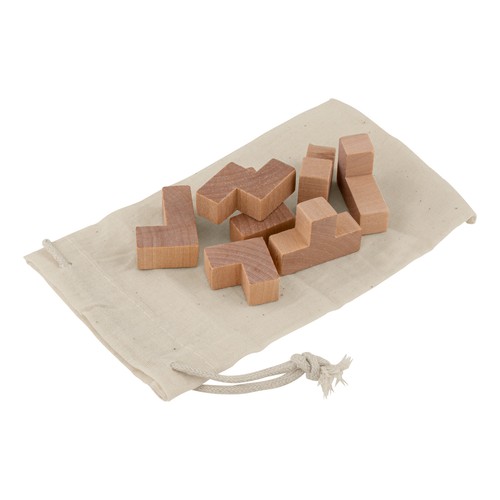 Skill game made up of 7 nestable pieces, made of pine wood, with a cotton bag for easy carrying.