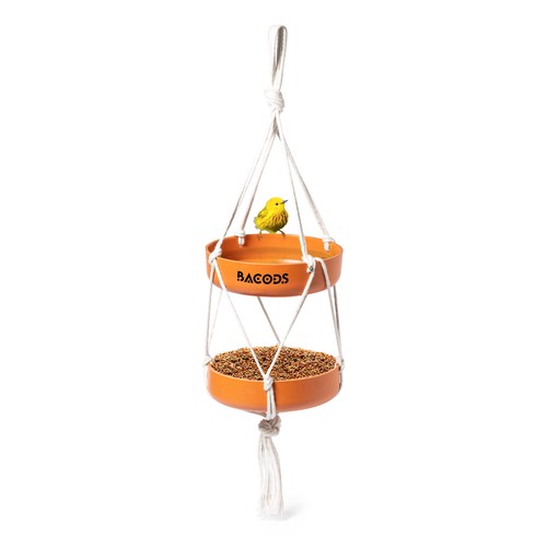 Hanging feeder for birds. With two bowls made of bamboo fibre (15 x 4 cm each) and resistant natural cotton string. Presented in an individual box with kraft design.