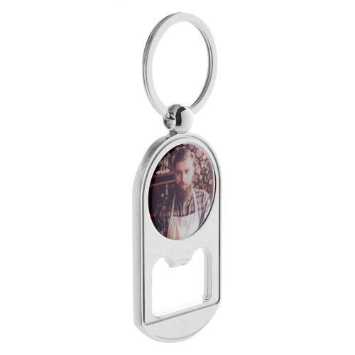 Metal bottle opener with keyring and epoxy dome. In black gift box. Price includes epoxy dome printing. MOQ: 100 pcs.